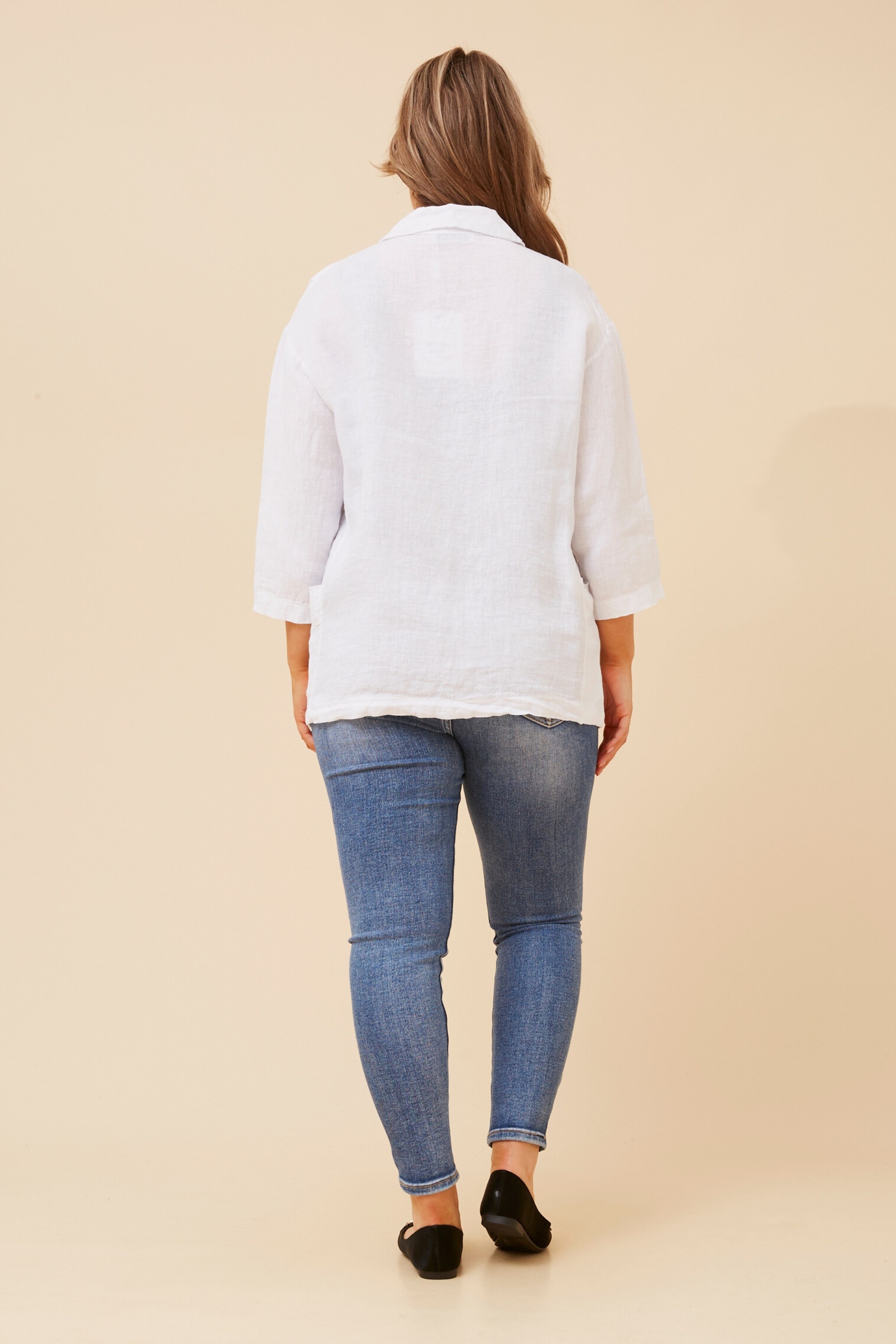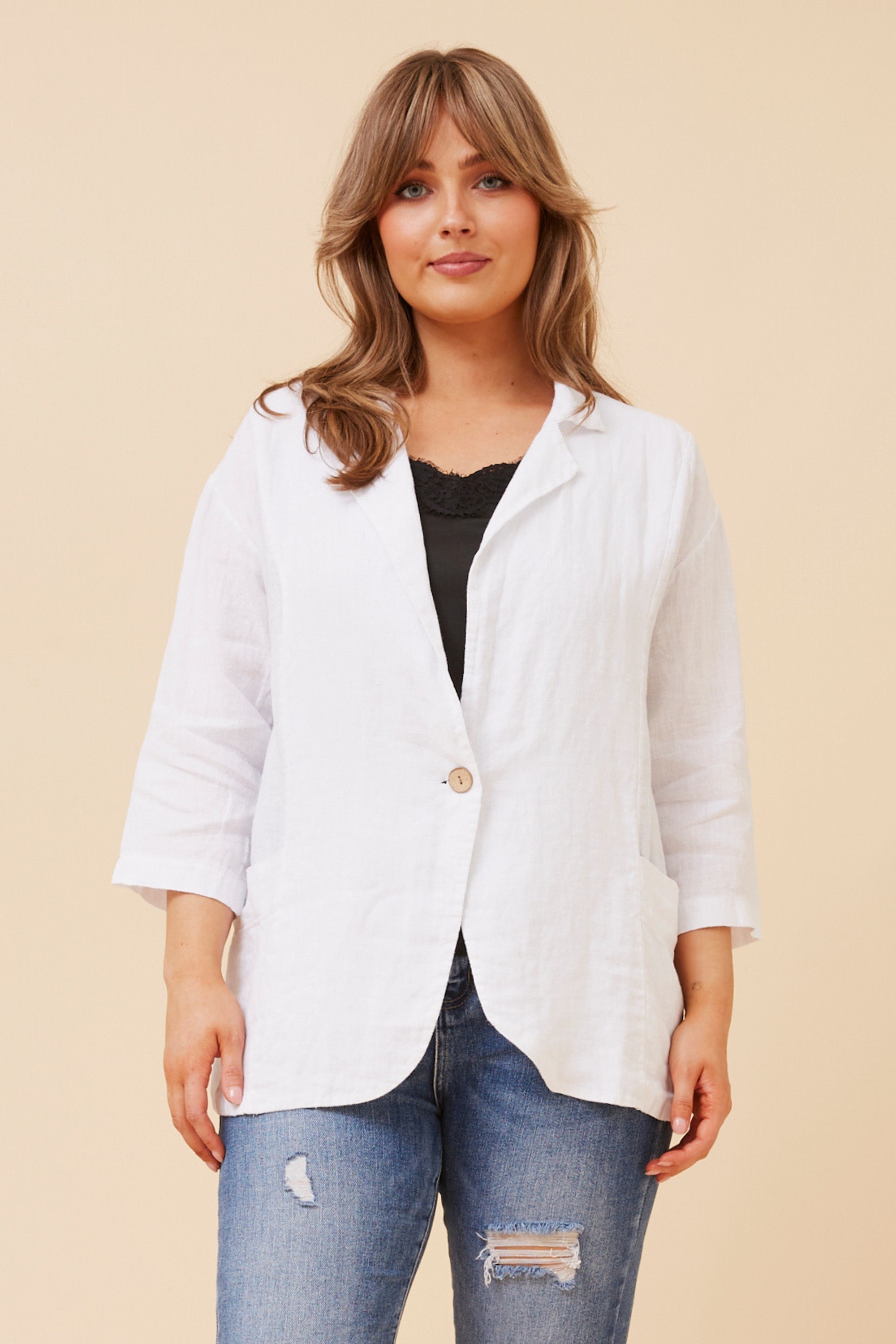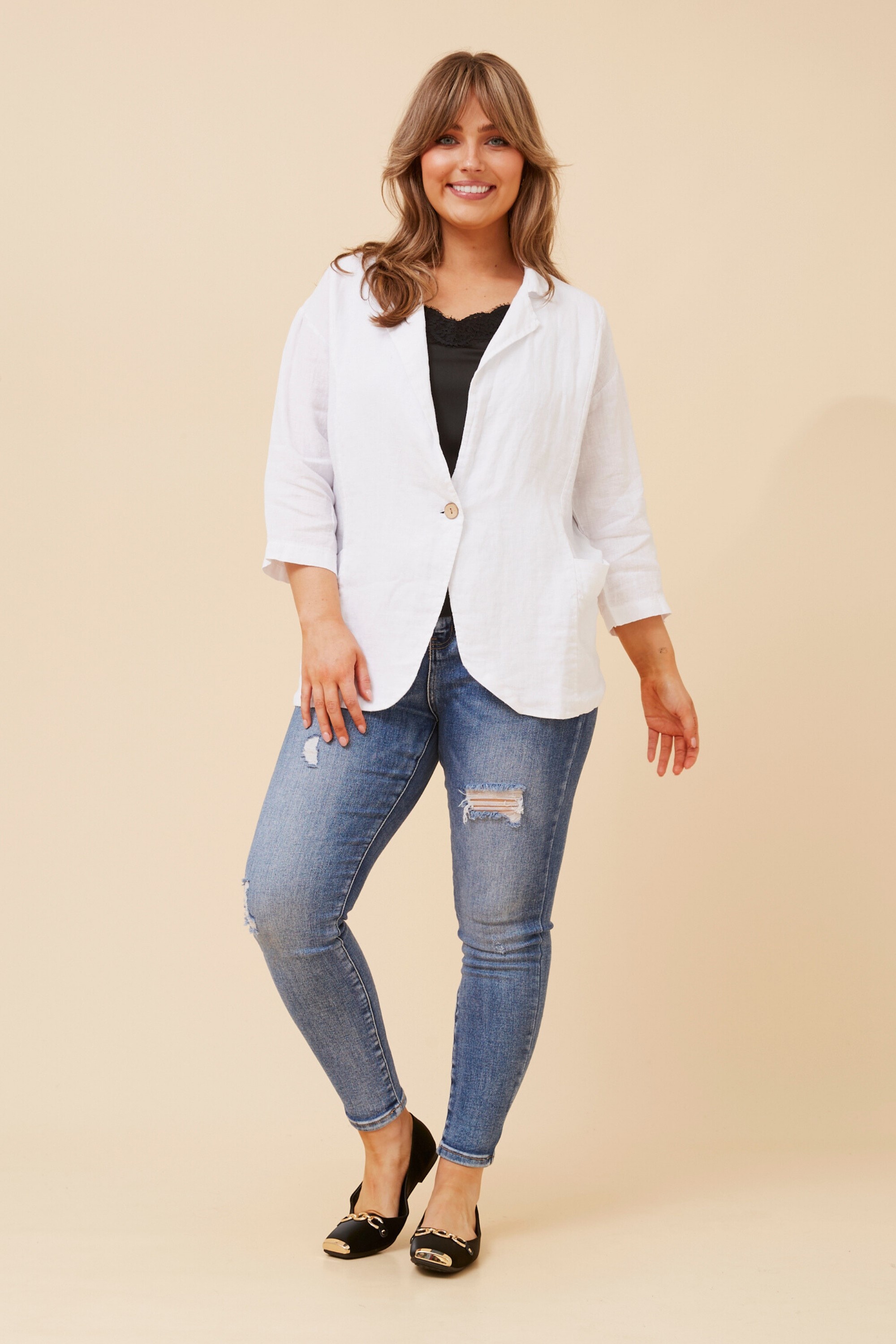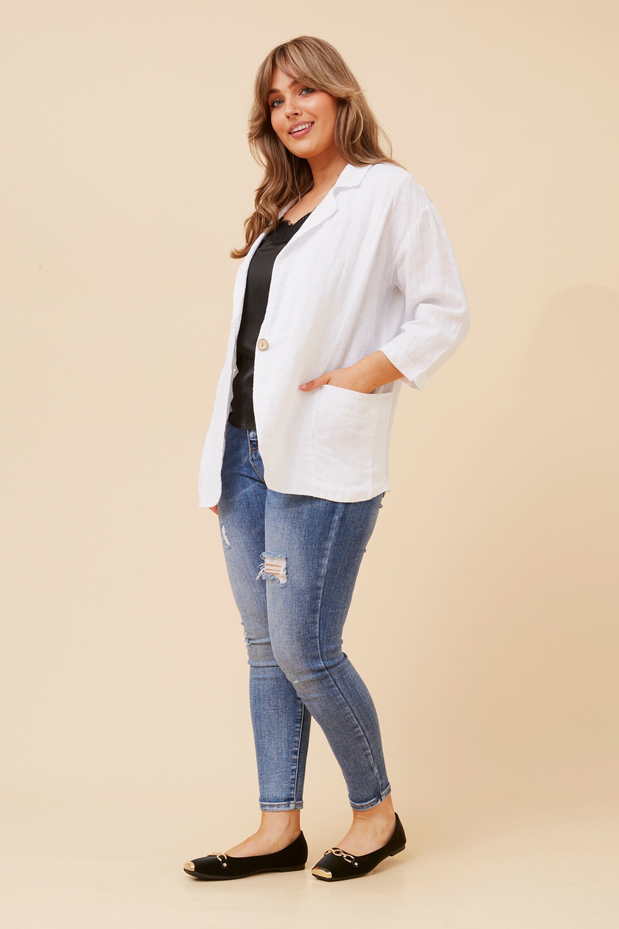 The Edera Linen Jacket is a lightweight, breathable layer that keeps you cool and comfortable while looking polished. Perfect for transitional days, it pairs effortlessly with jeans, trousers, or dresses for an easy, versatile finish.