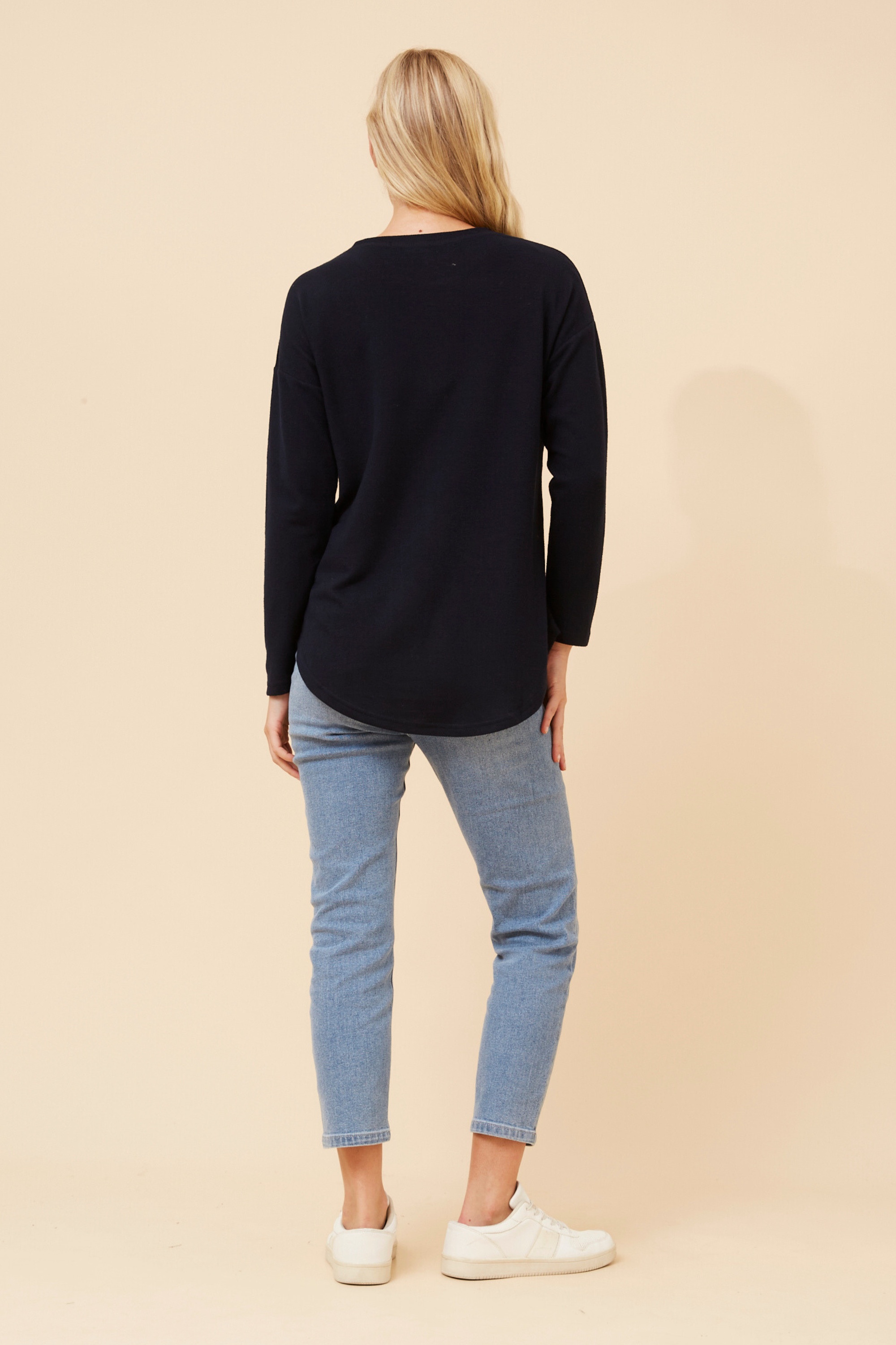 For an effortless and relaxed everyday look, pair the Eva top with your favorite jeans and runners. The top is also easy to dress up with black skinny pants and ankle boots for a chic day out look!