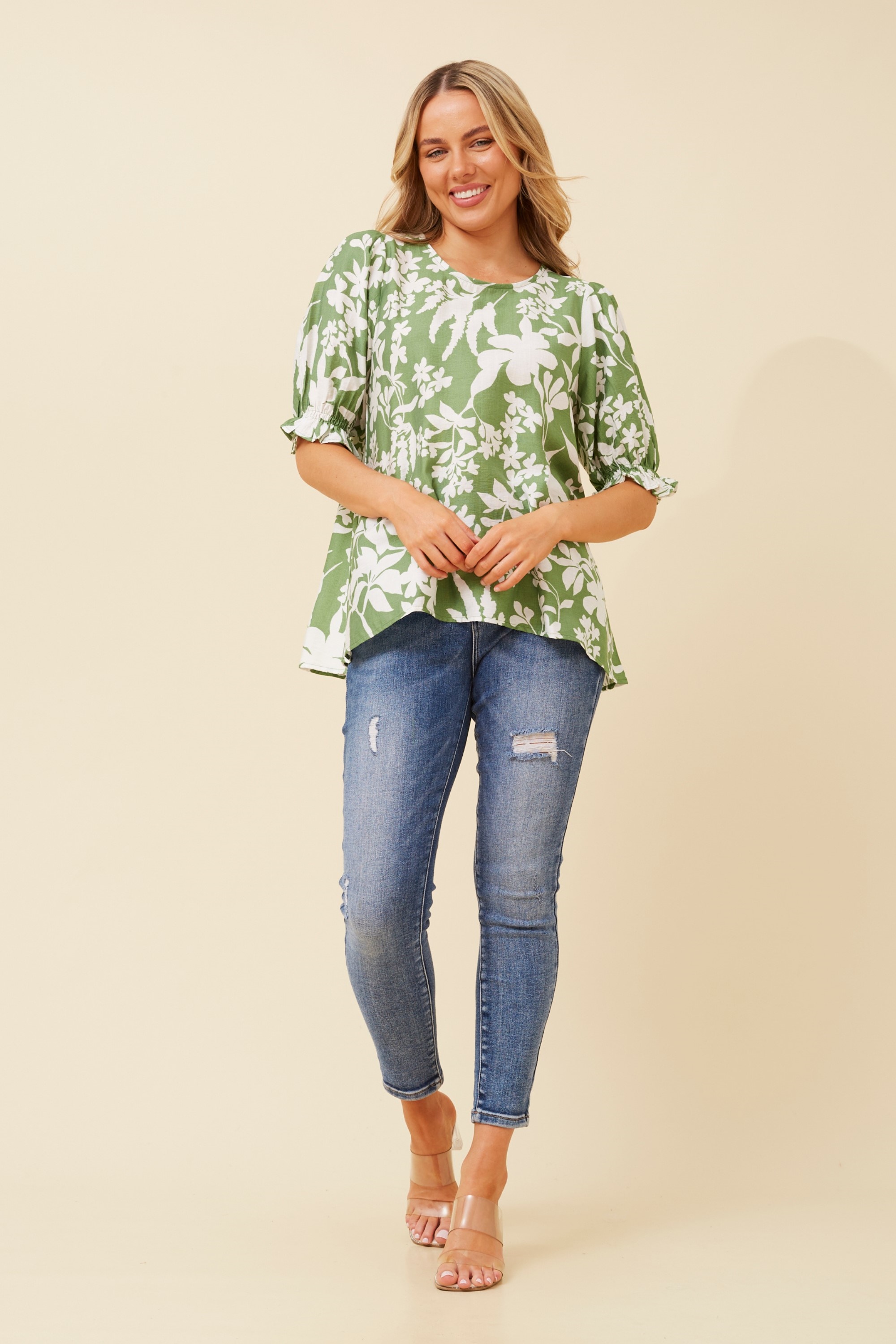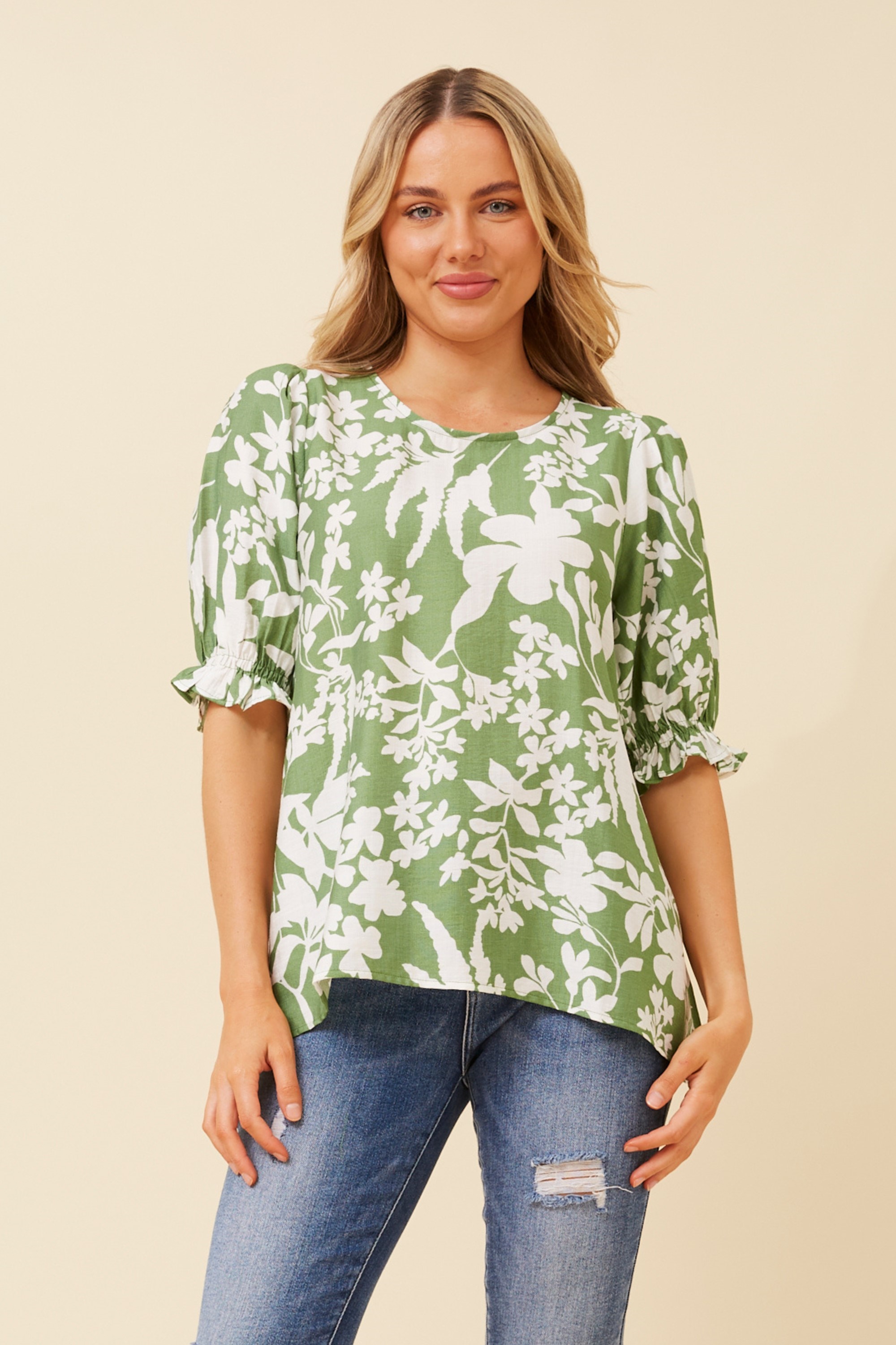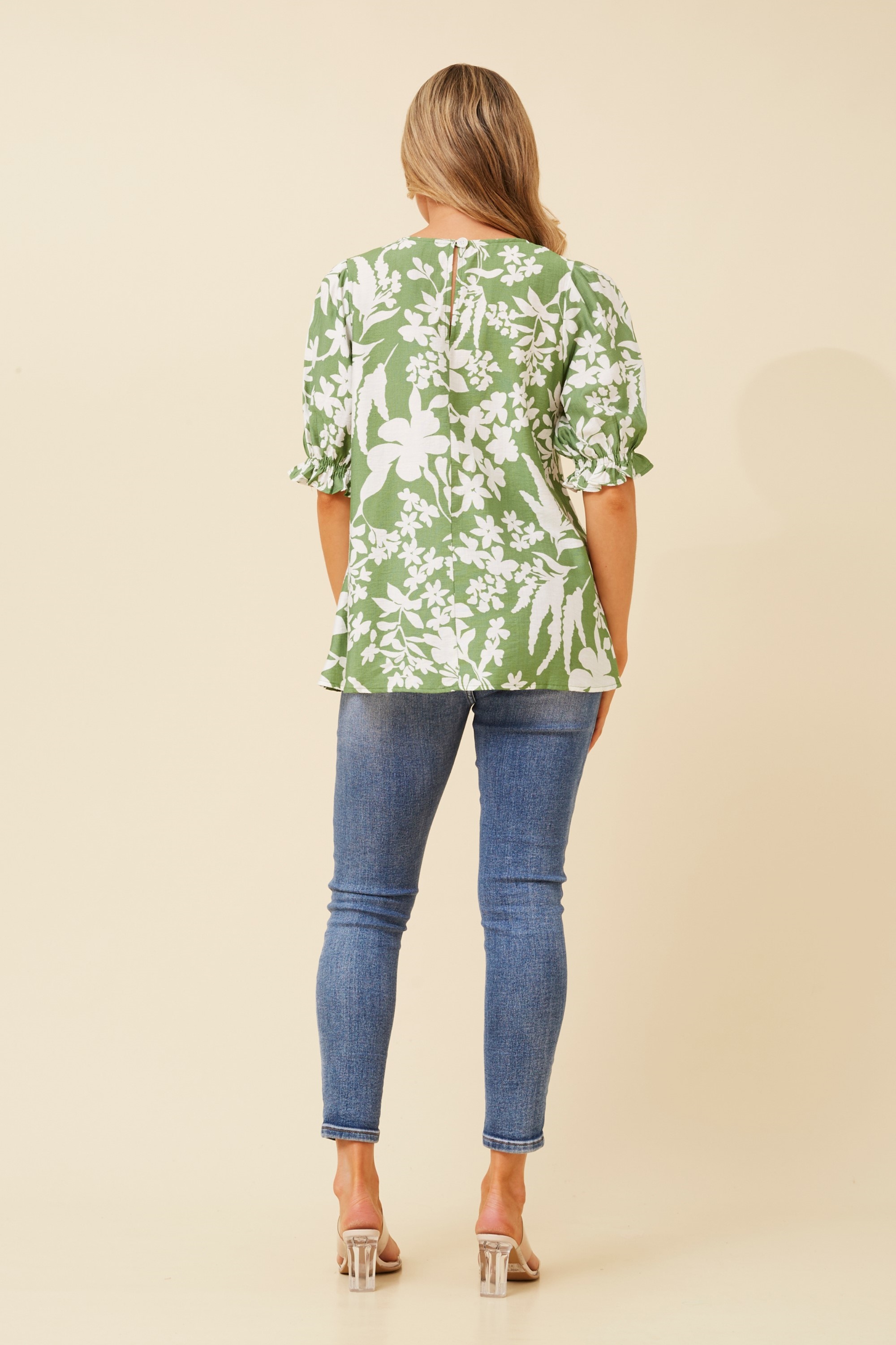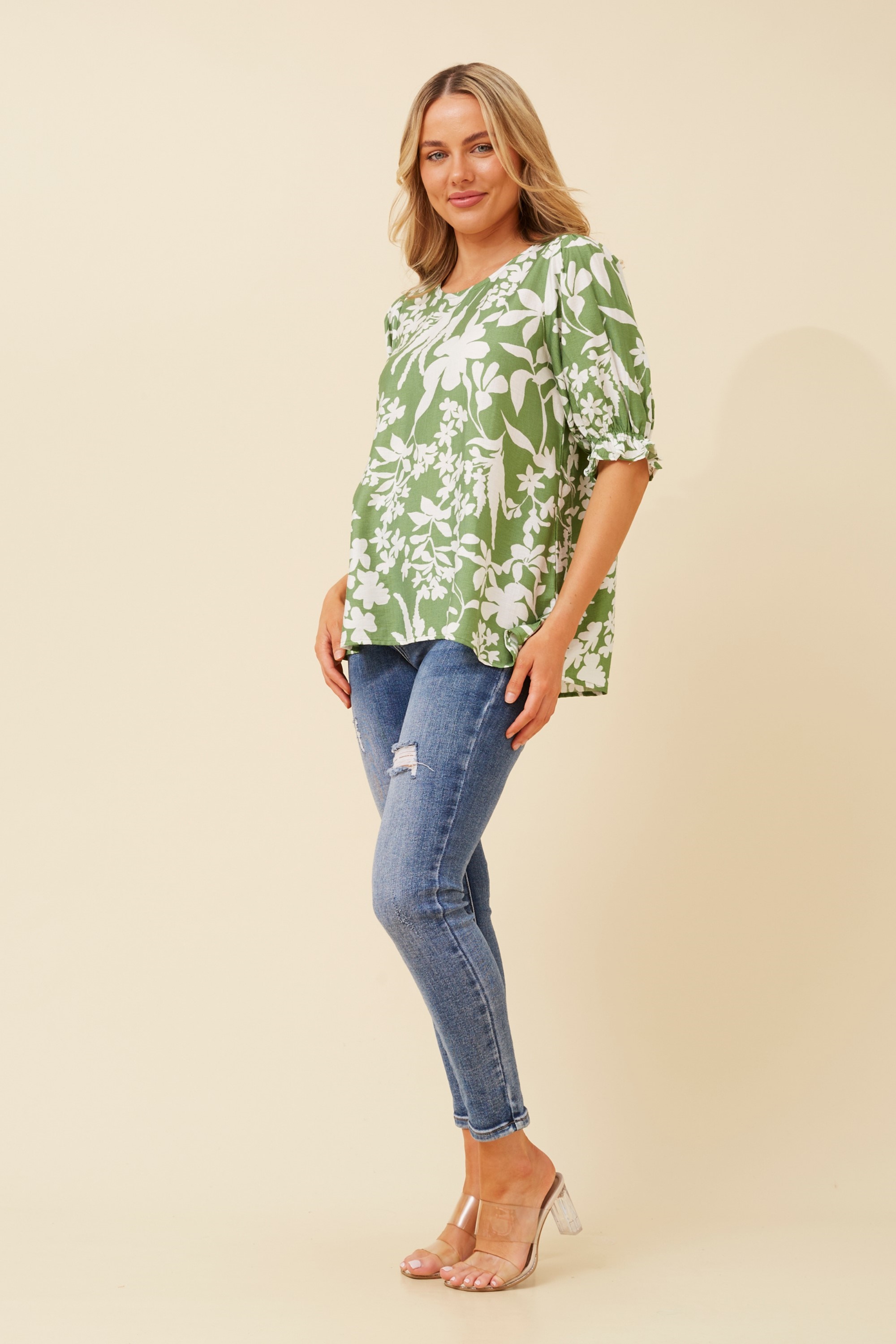 The Journi top features an elegant leaf print and feminine sleeves. Pair it with jeans or shorts for a fresh look this season!