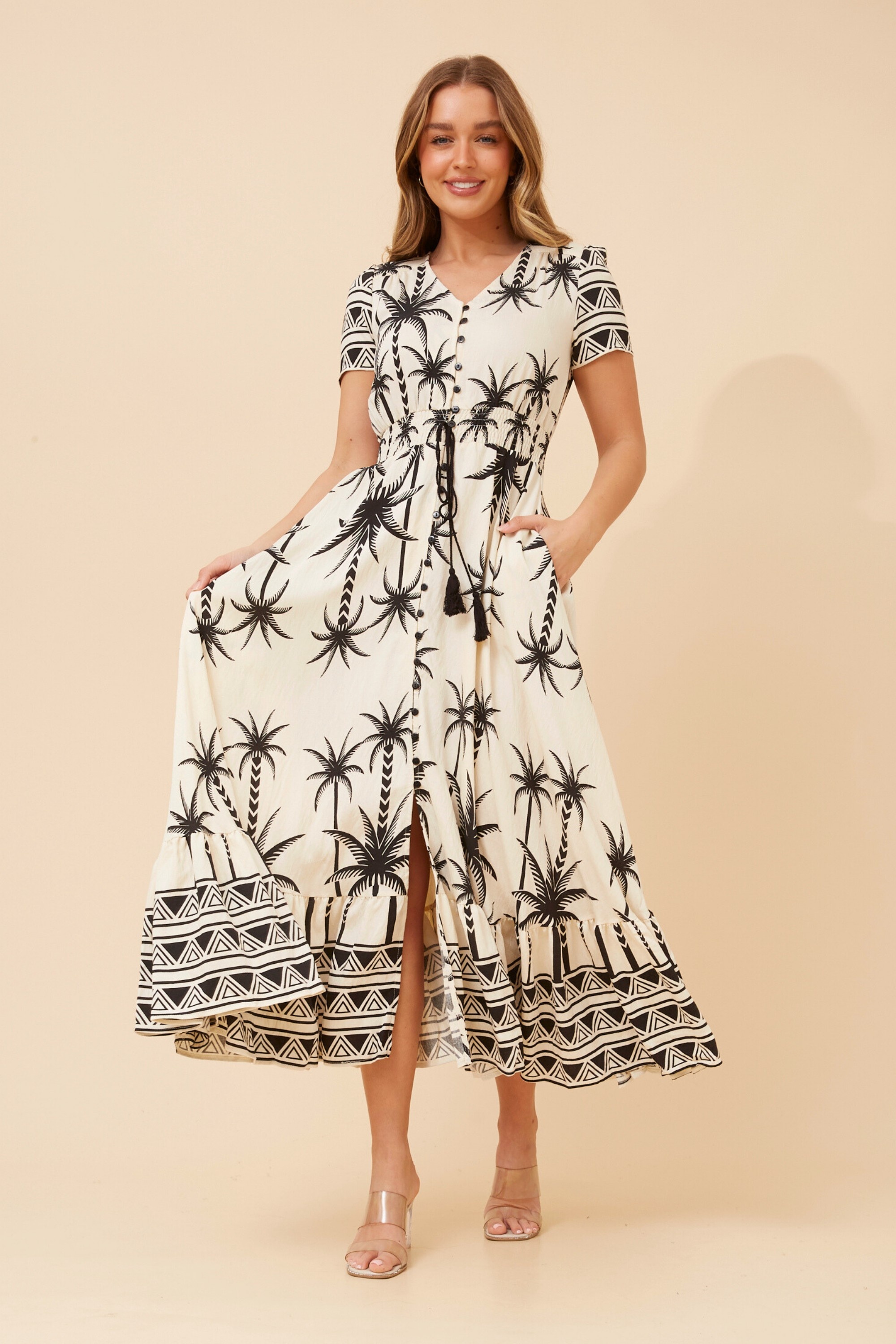 Bring vacation vibes to your wardrobe with the Phaidra Maxi, featuring a playful palm tree print. Style it with flat sandals and a straw hat for a sun-ready look, or add wedges and a crossbody bag for a chic evening by the water.