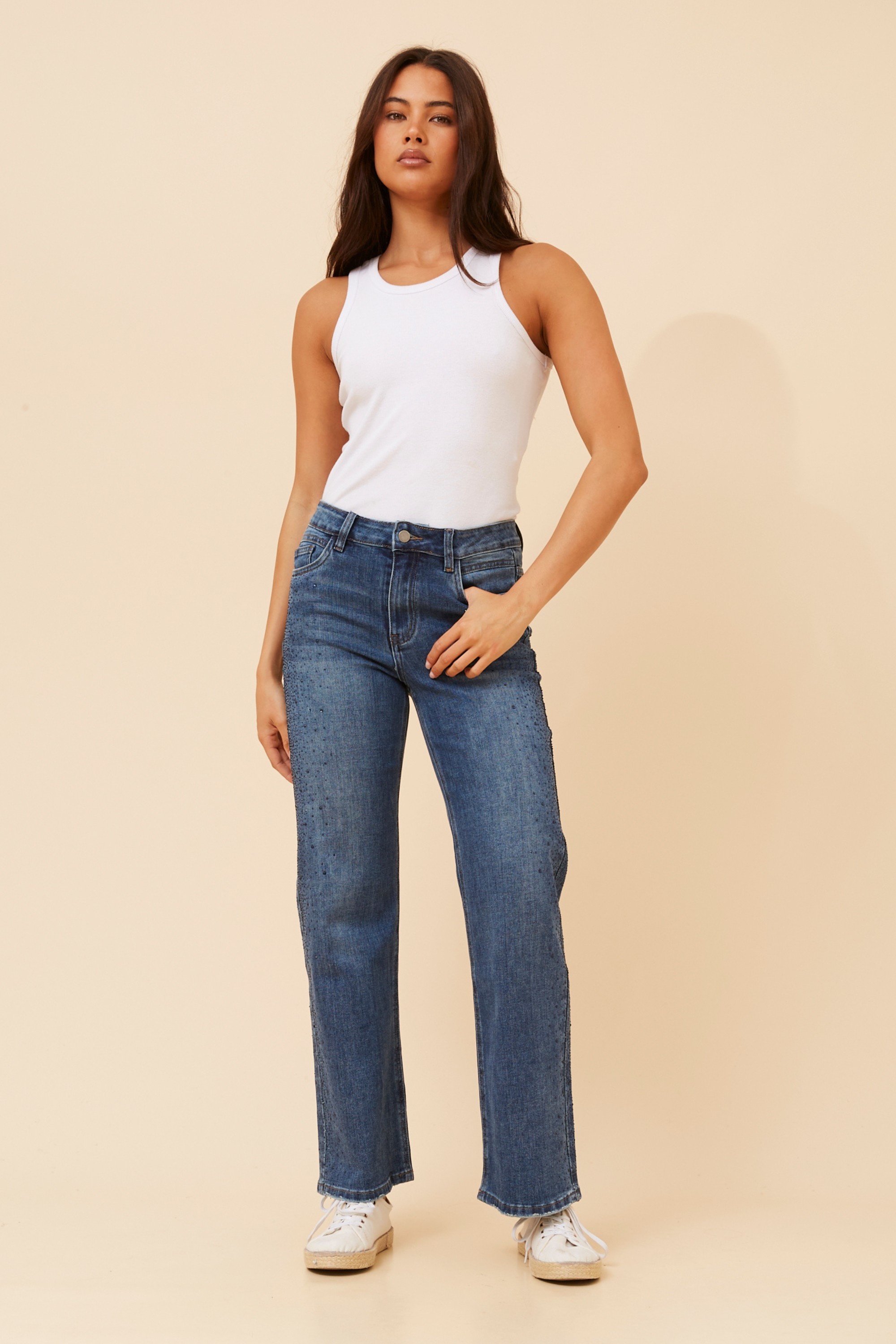 Elevate your everyday style with these standout denim pants, featuring subtle diamante detailing for a touch of sparkle. Perfectly versatile, they pair effortlessly with sweaters, tees, or blouses for a chic, polished look!