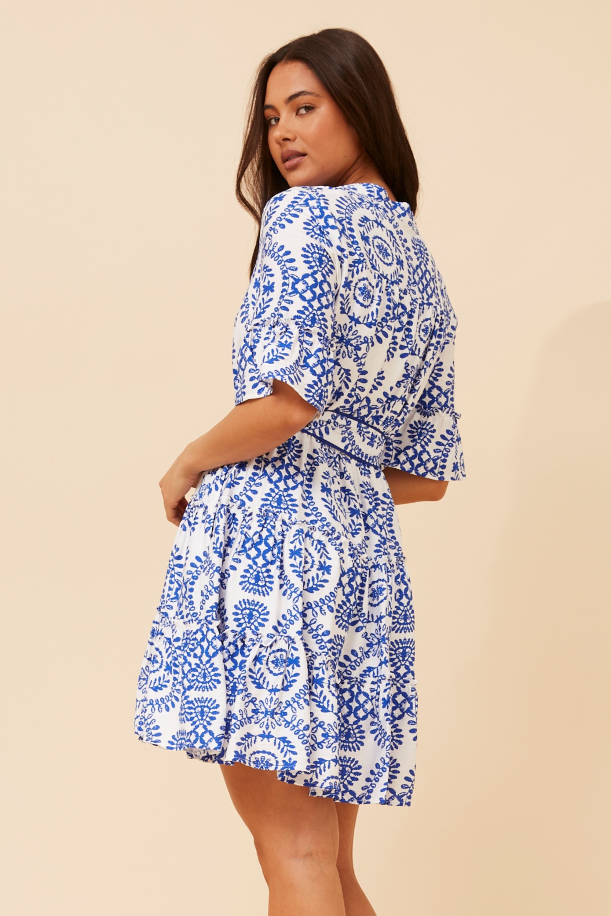 The Nathalia Dress features intricate mimic embroidery and a bold print, with a tie waist for a flattering, cinched silhouette. Perfect for garden parties or daytime events, style it with minimalist heels and a chic handbag to complete the look.