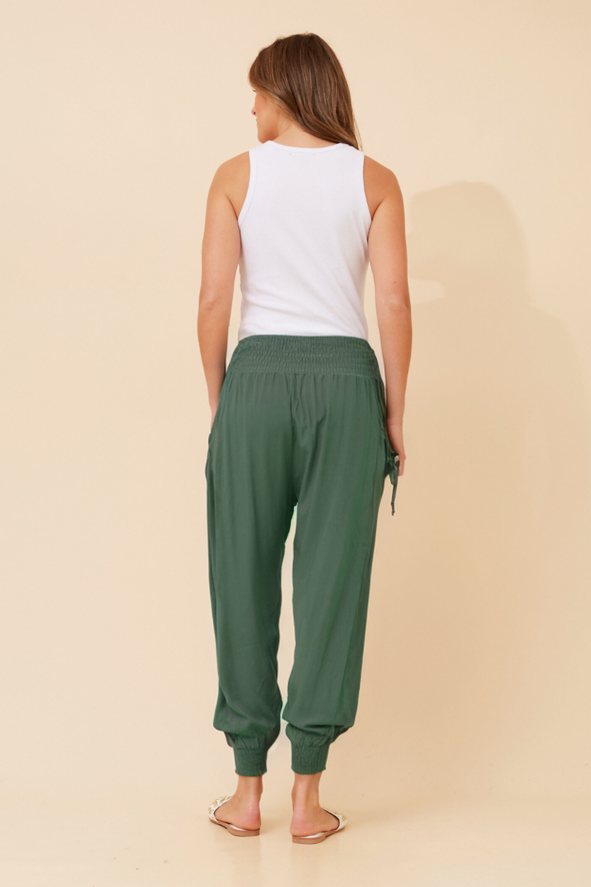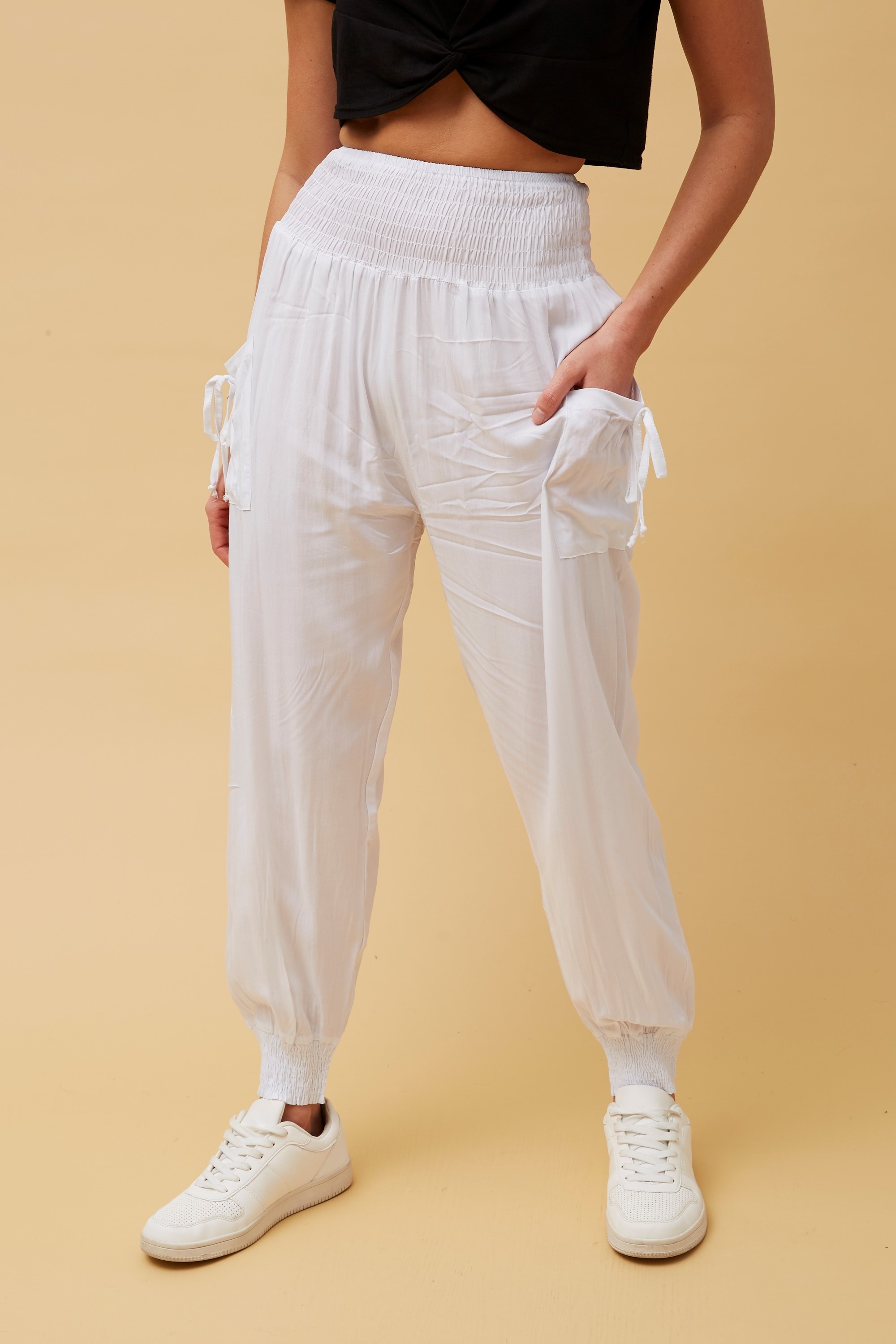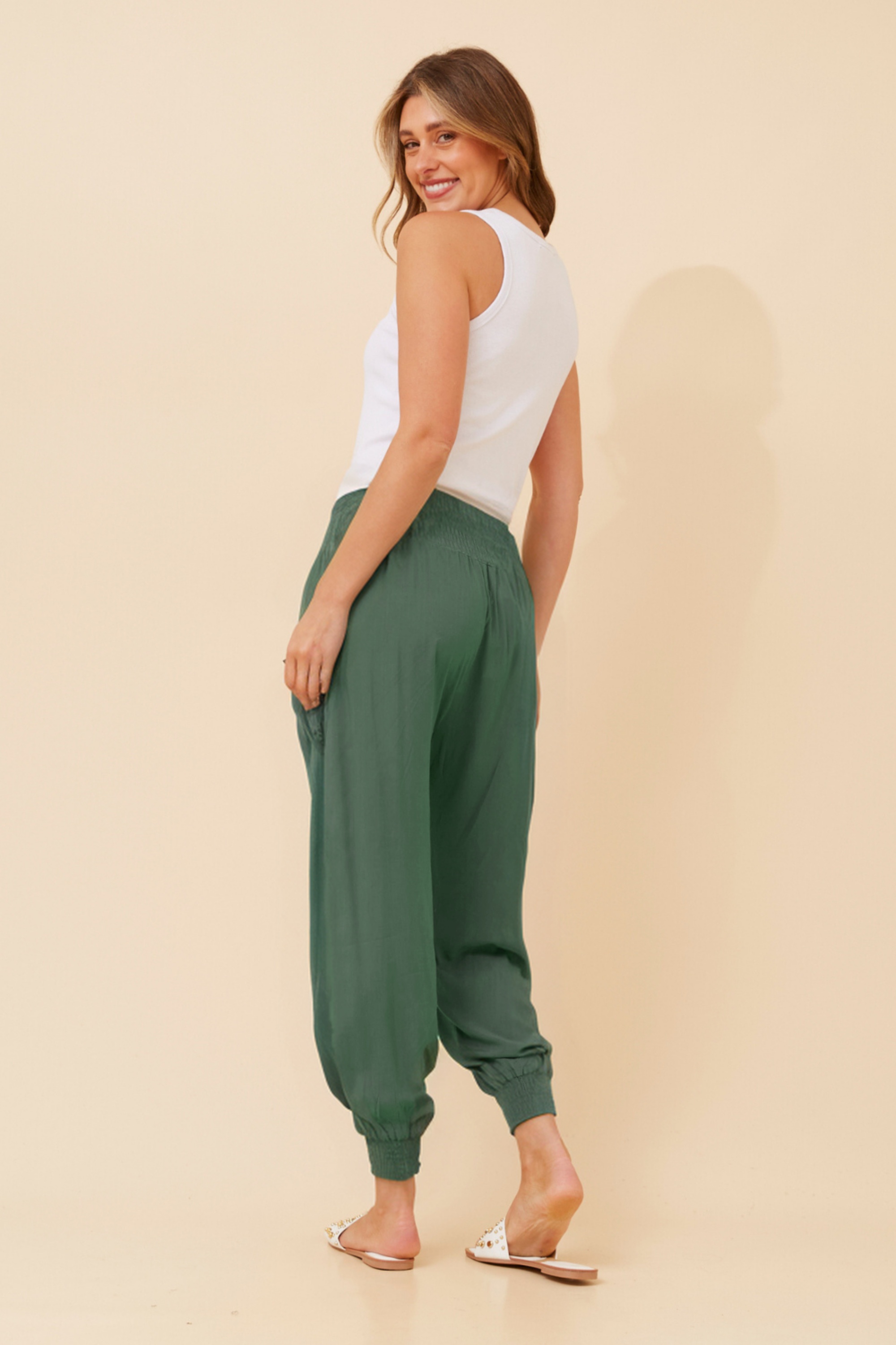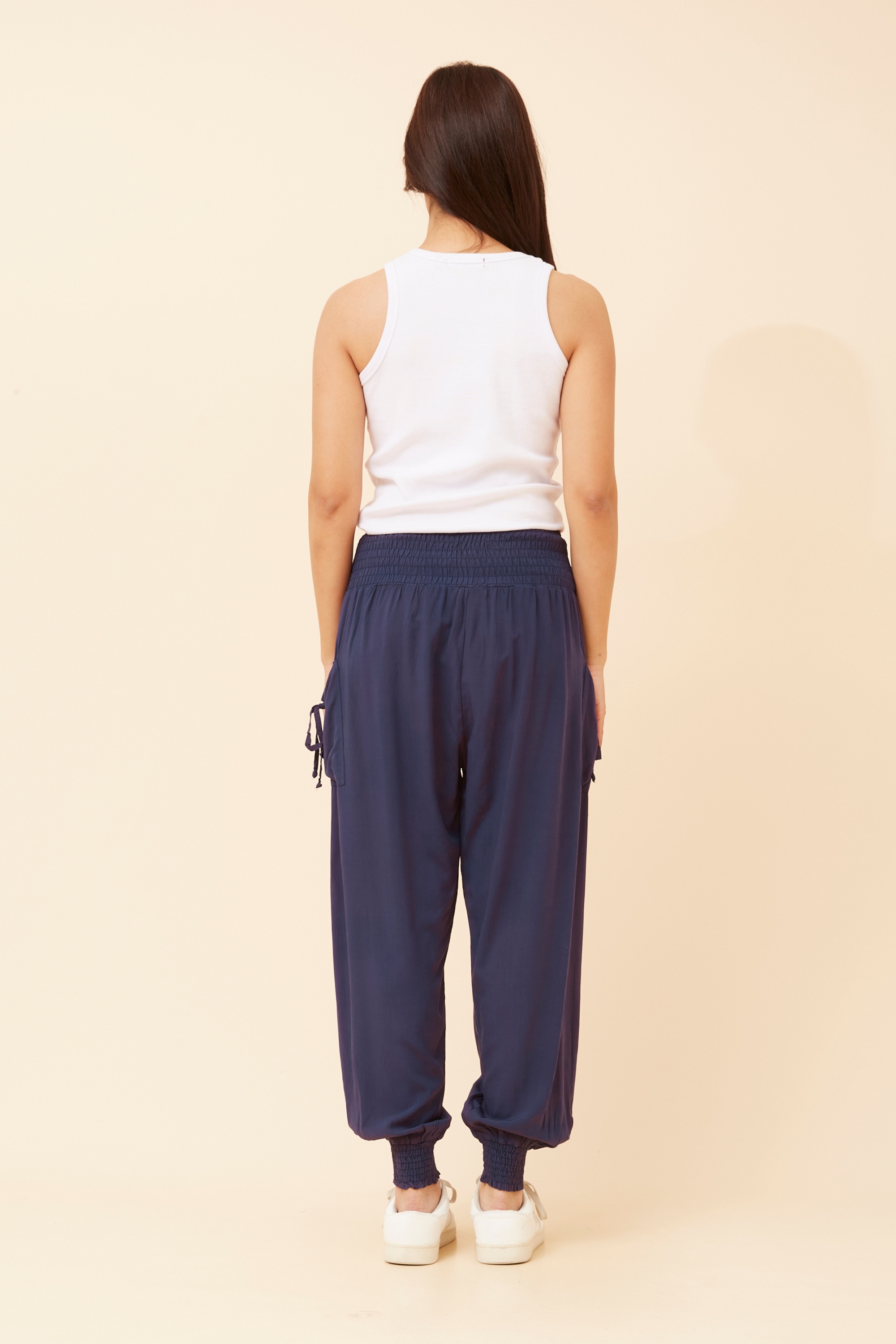 These stylish harem pants are a must have piece for summer styling. A shirred waistband ensures comfortable all-day wear. Elasticated leg cuffs create further shaping for that classic harem look. Easy to style with a fitted crop top or tucked in boxy T-shirt!