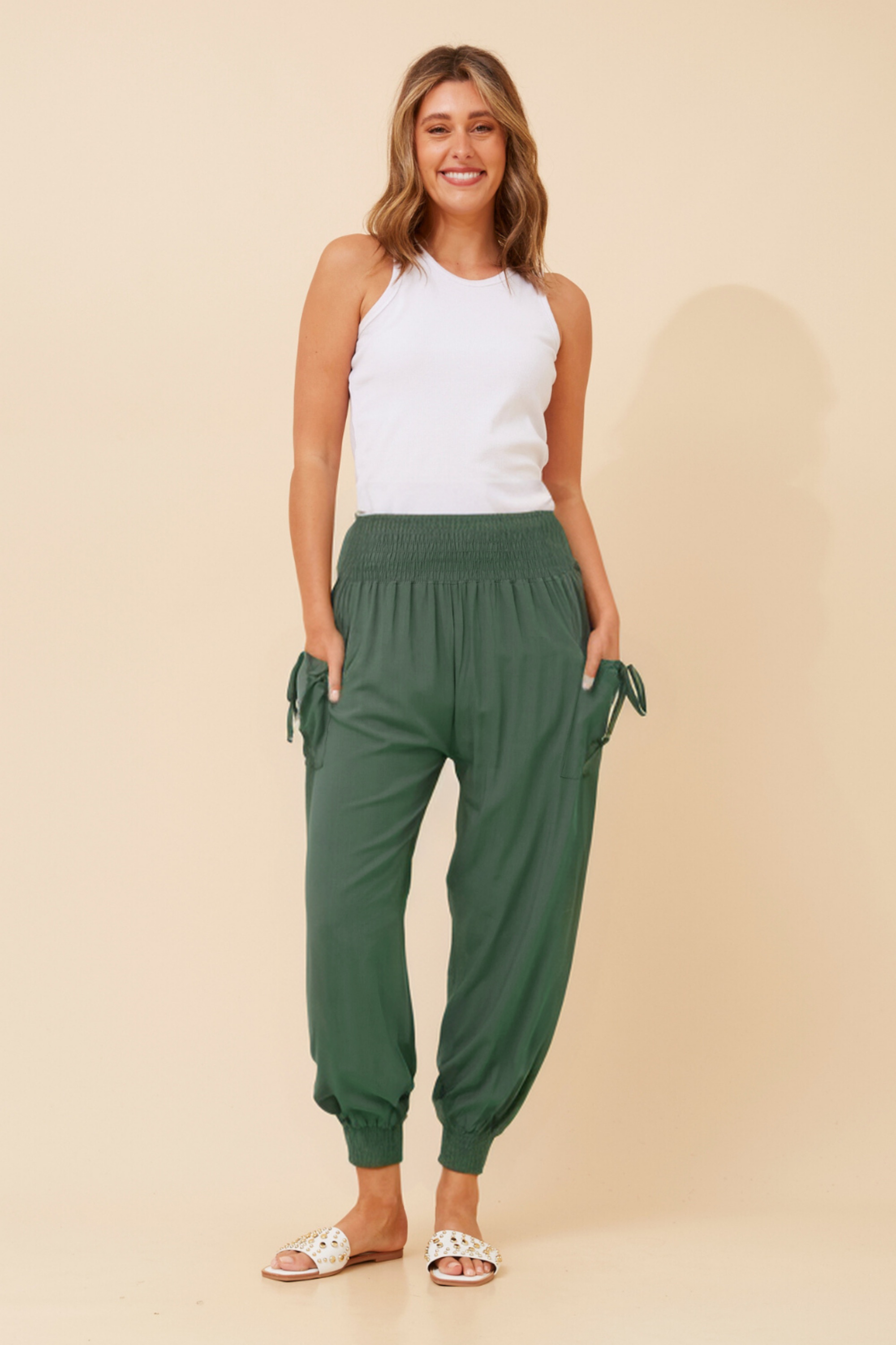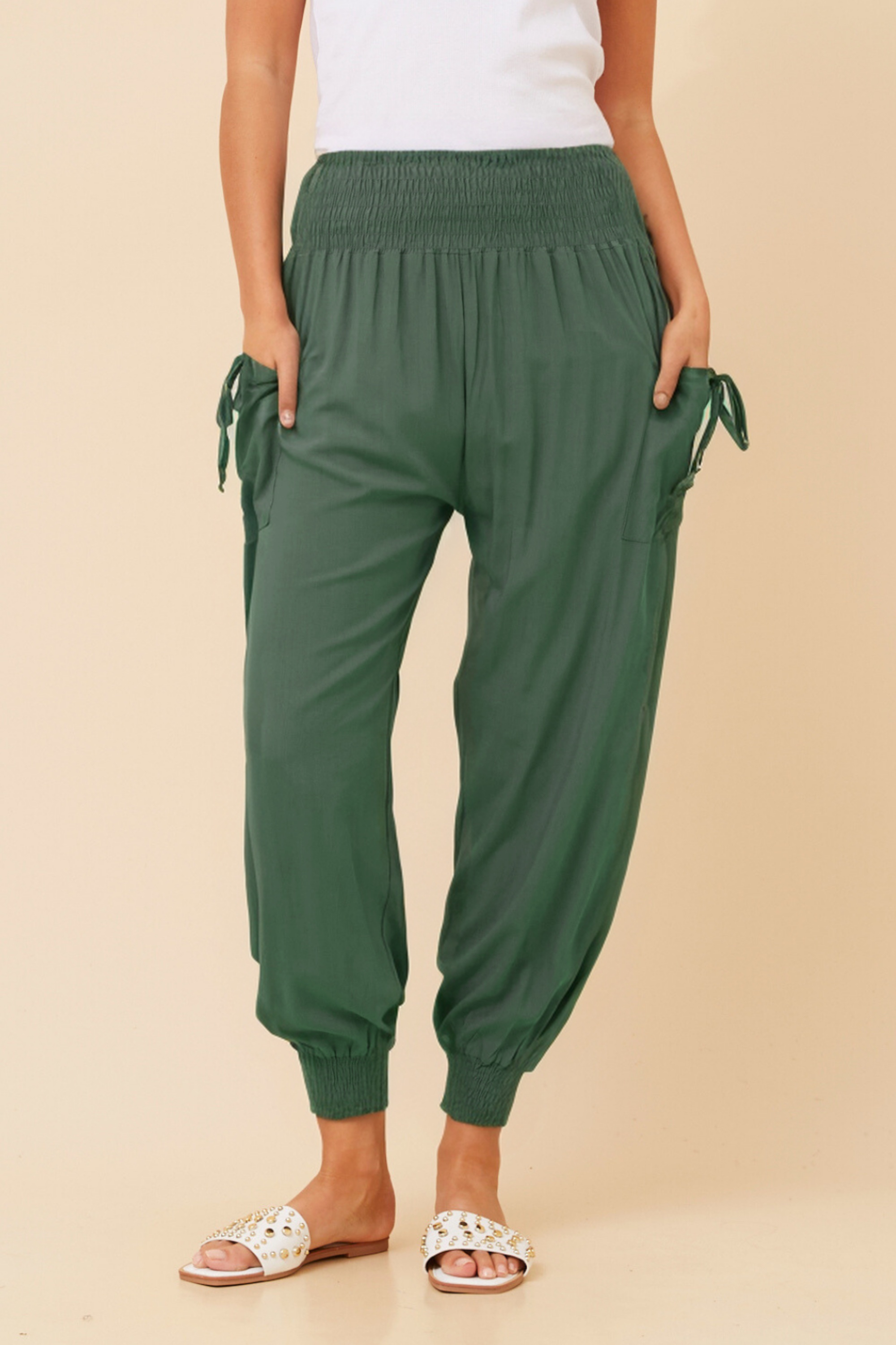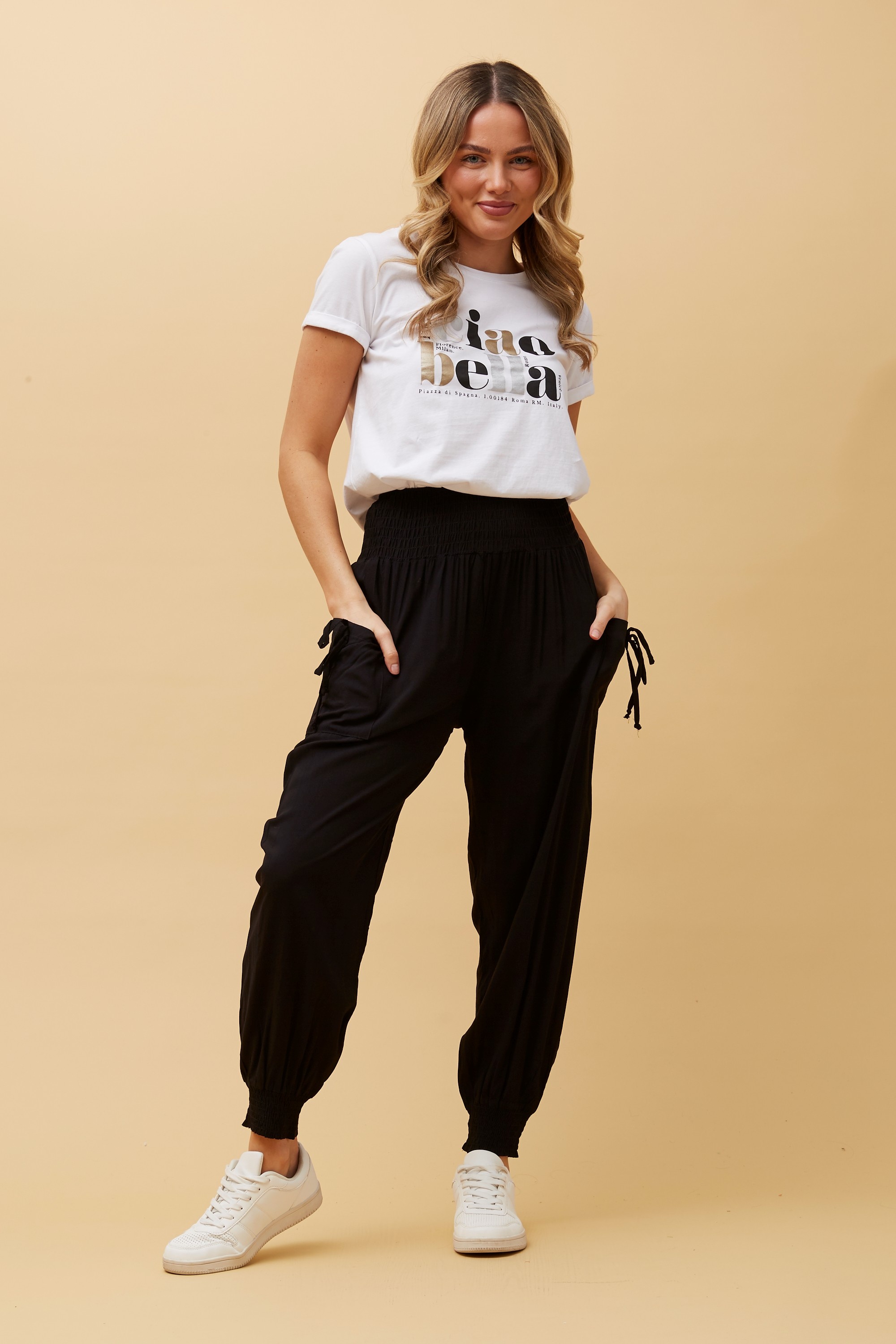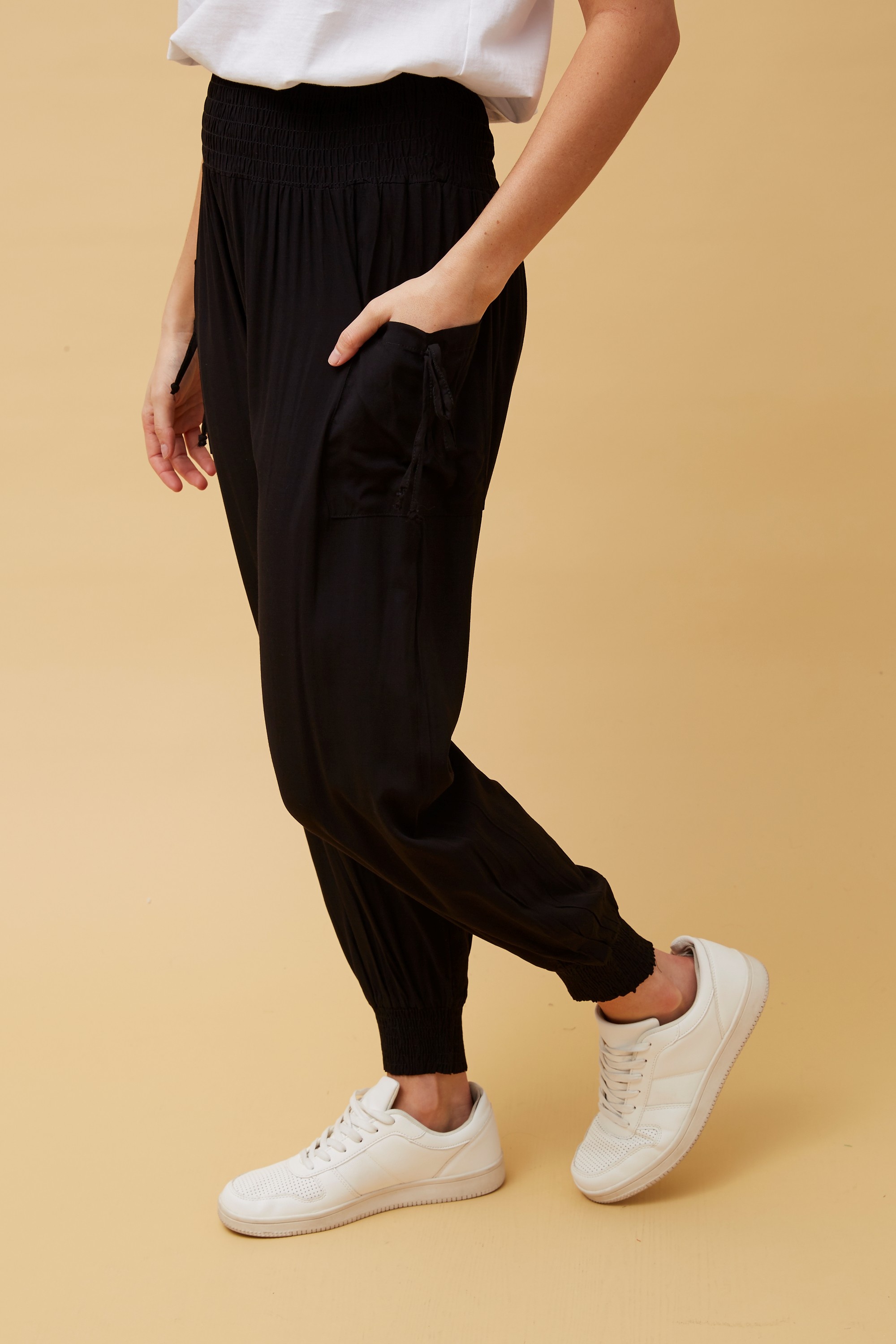 These stylish harem pants are a must have piece for summer styling. A shirred waistband ensures comfortable all-day wear. Elasticated leg cuffs create further shaping for that classic harem look. Easy to style with a fitted crop top or tucked in boxy T-shirt!