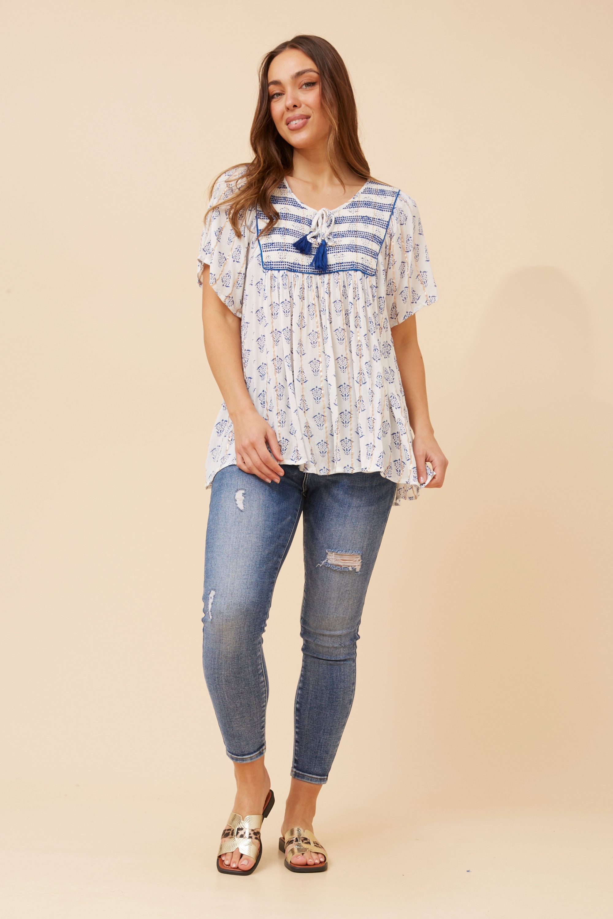 Our Vimala top features gorgeous embroidery detail and can be matched with jeans or white pants and sandals to achieve a stylish and relaxed look.