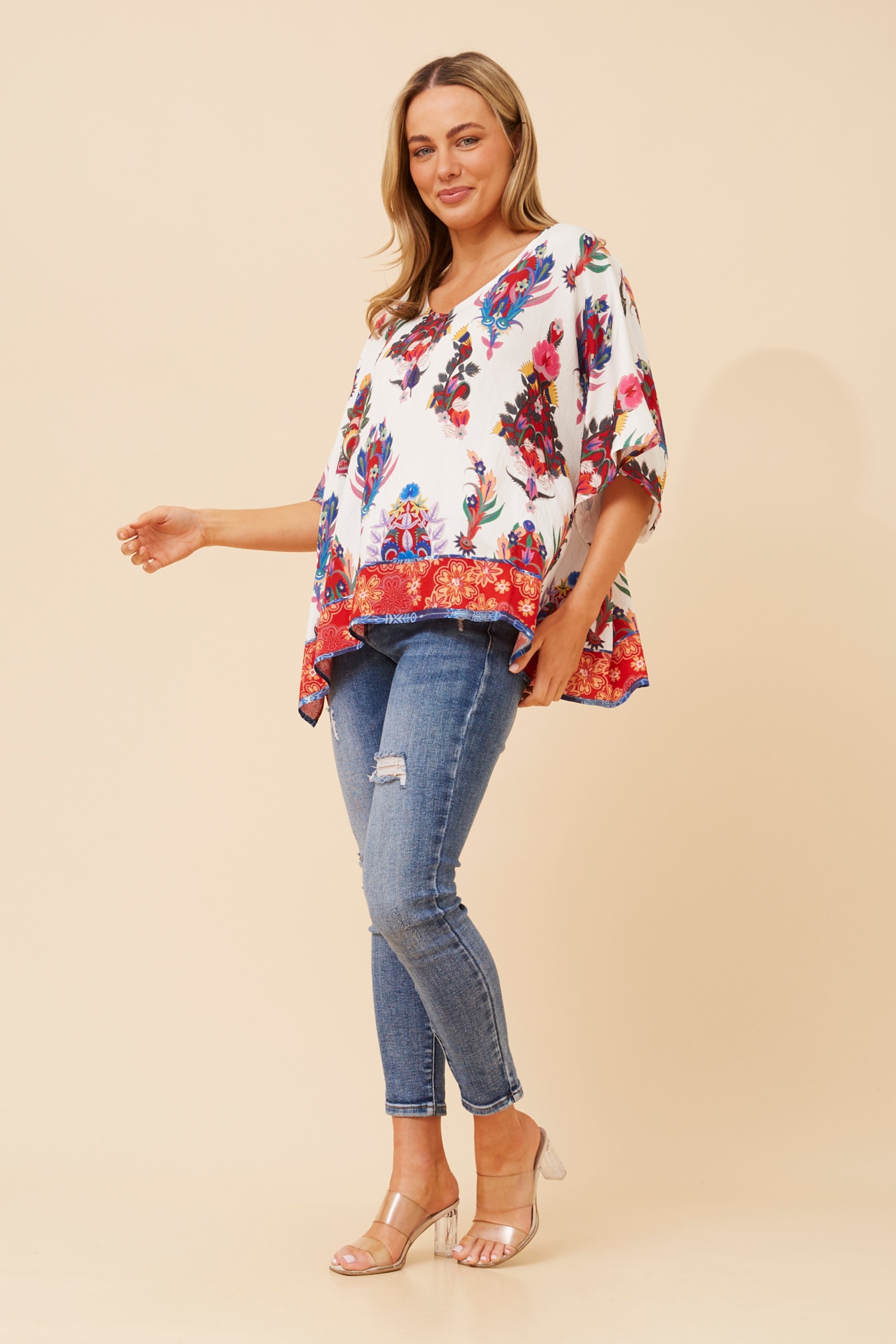 Our Wynton Top pairs well with tailored shorts or wide leg trousers. Featuring a bold border print and a floaty silhouette, it creates a chic, effortless look for day or evening.